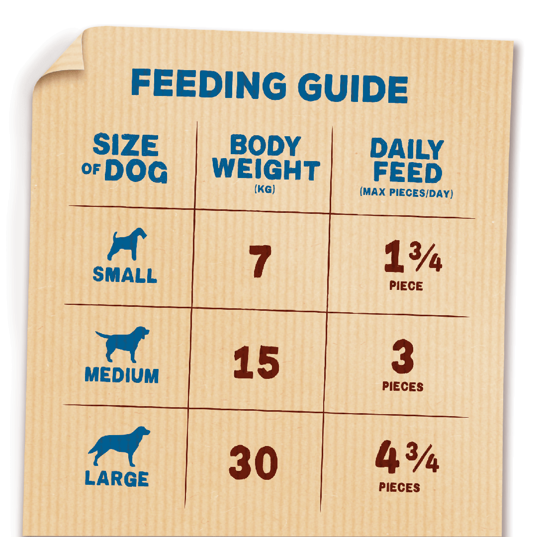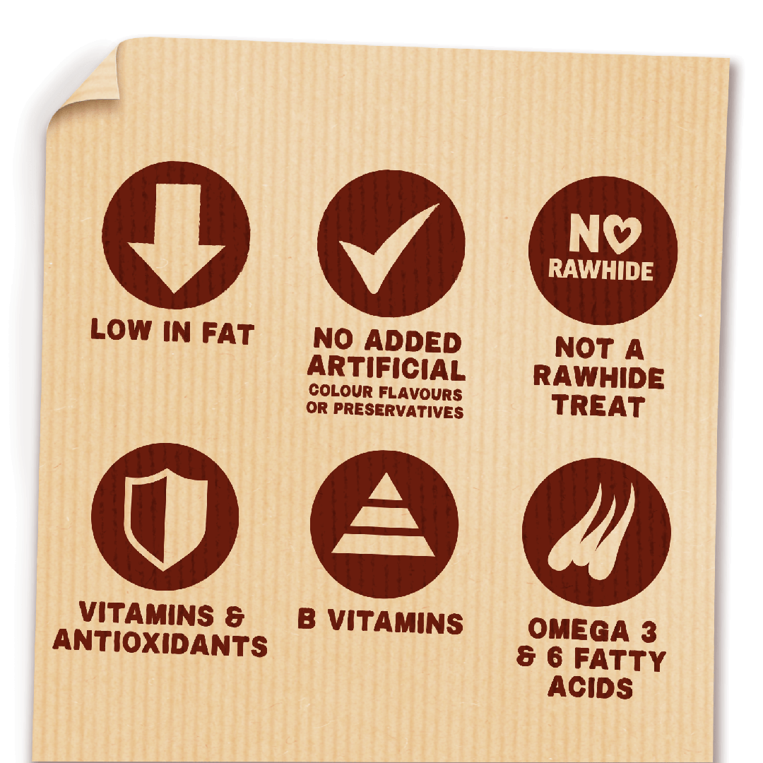 Each treat contains omega 3 & 6 to help maintain healthy skin & a glossy coat, Vitamins & antioxidants to help support natural defences and is supplemented with B Vitamins to help maintain your dog’s energy levels. With a low in fat recipe, they also help maintain a healthy waistline.*