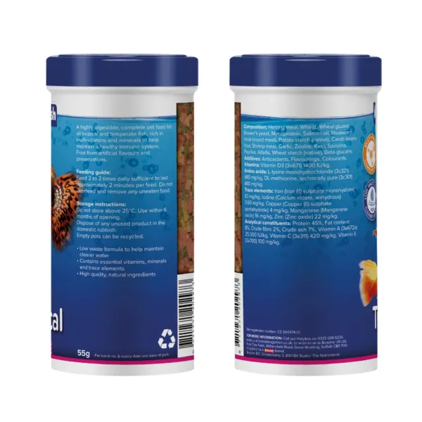King British Tropical Flake is a highly palatable, complete food composed of premium proteins derived from insects, selected marine animals and zooplankton. It also contains marine and freshwater algae.