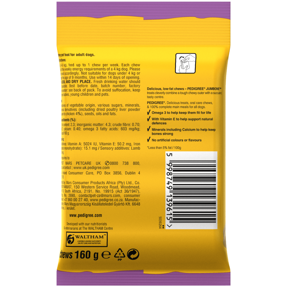 Delicious, low-fat chews – PEDIGREE® JUMBONE™ treats cleverly combine a tough chewy outer with a succulent, tasty centre.