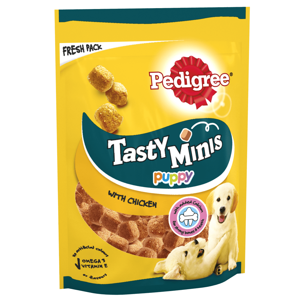 Succulent bitesize treats – PEDIGREE® TASTY MINIS Puppy are soft, chewy chunks, specially designed with added calcium to help support the growth of strong teeth & bones. Ideal for training, rewarding or just treating your dog at any time.