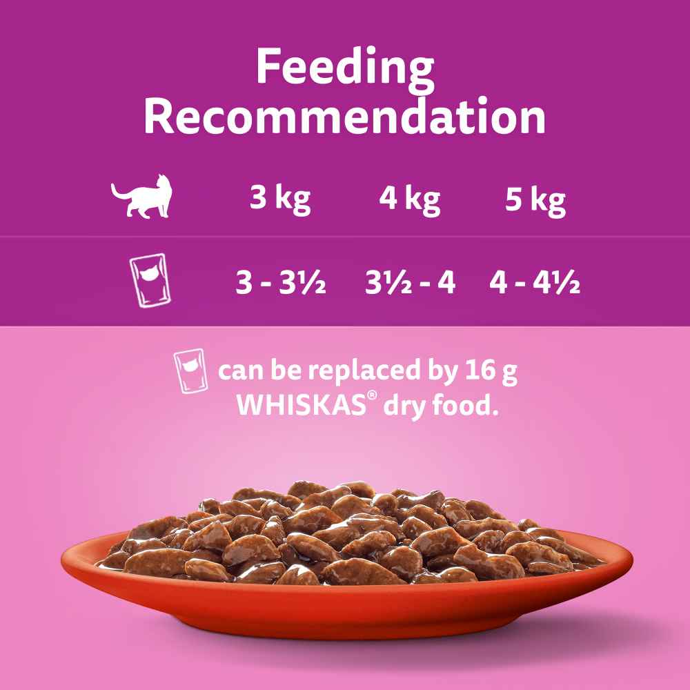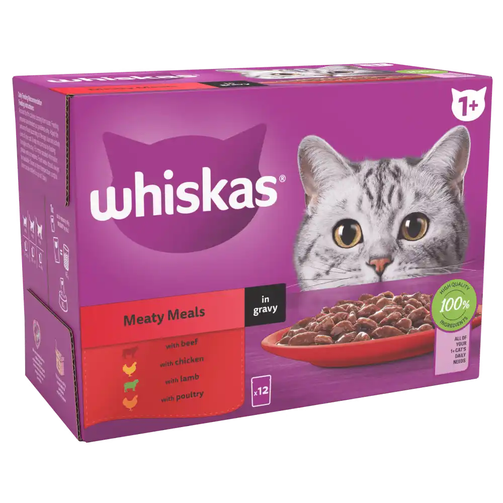 WHISKAS® Meaty Meals 1+ adult cat food pouches in gravy are specially prepared to preserve the natural goodness and deliciousness of high quality ingredients and will see your cat rush to the bowl faster than ever before! Made with sustainably sourced ingredients, these cat food pouches contain everything your cat needs to keep them happy and healthy.